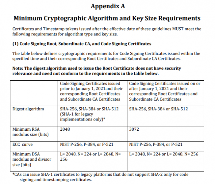 Theo tiêu chuẩn mới của tổ chức CA/B Forum, kể từ ngày 01/01/2021, tất cả các hãng CA đều phải ngừng cung cấp chứng thư số Code Signing SHA1. Theo đó thì keysize tối thiểu cũng nâng lên từ 2048bit lên 3072bit.