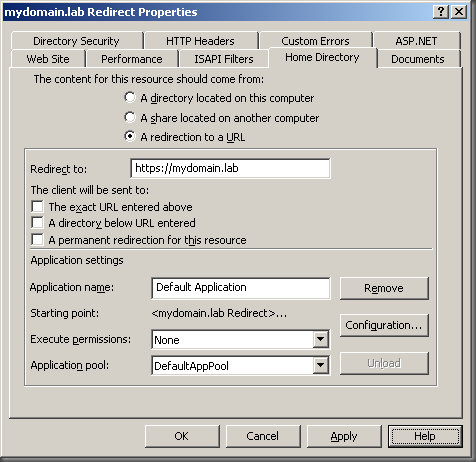 5. Nhấp chuột phải vào Website Redirect và chọn Properties. Sau đó chọn tab Home Directory. Trong mục The content for this resource should come from, chọn mục A redirection to a URL và nhập vào giá trị https://yourdomain.com. Sau đó nhấn Apply.